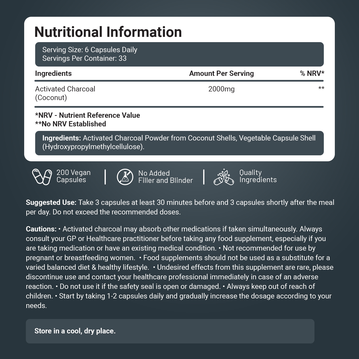 Activated Charcoal Powder from Coconut Shells, Vegetable Capsule Shell (Hydroxypropylmethylcellulose)