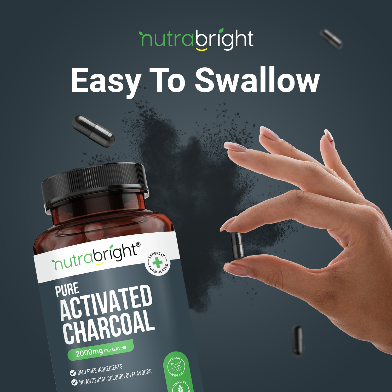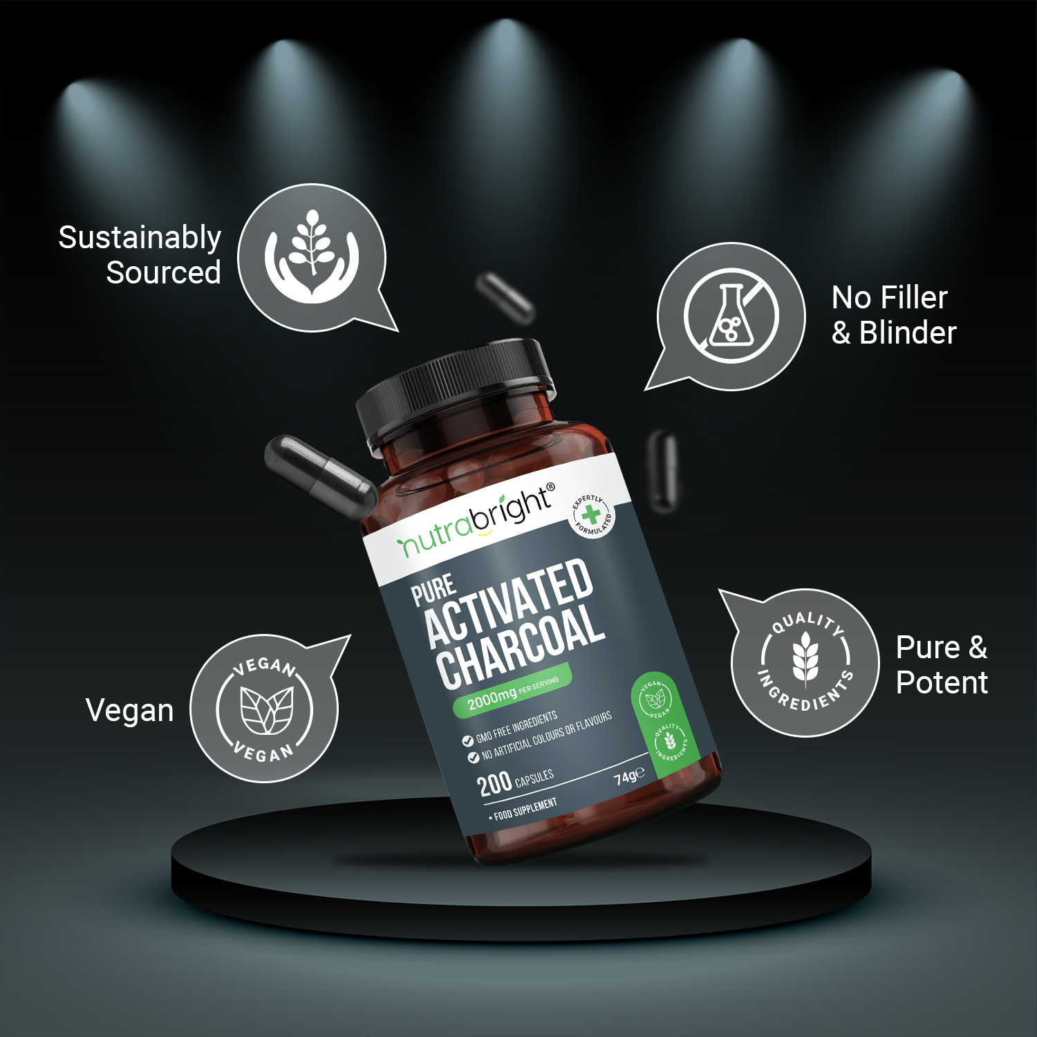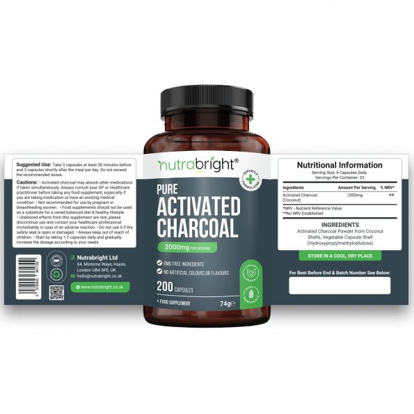 Nutrabright Pure Activated Charcoal – 200 Capsules – 2000mg – Bloating – Gut & Digestive support
