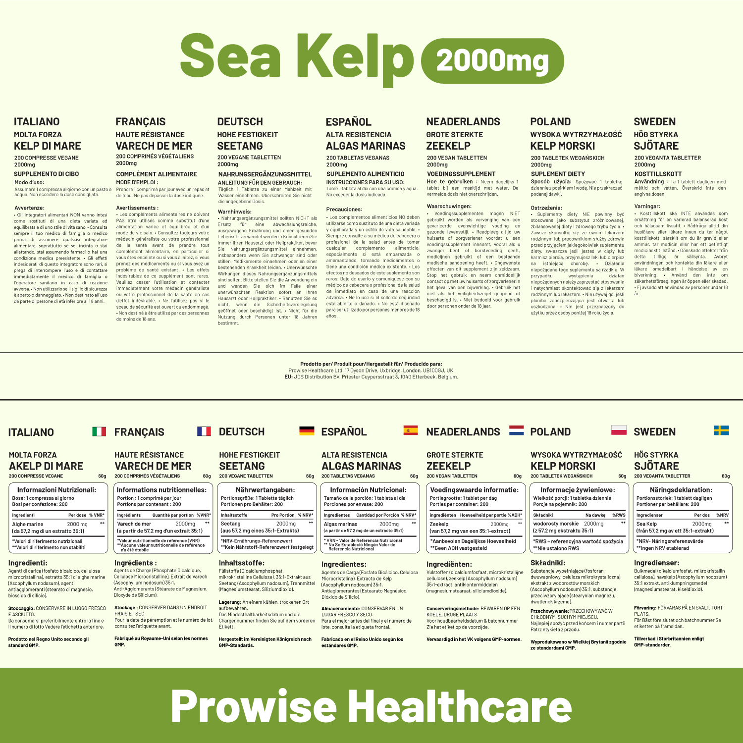 SEA KELP HIGH STRENGTH 2000MG – Prowise Sea Kelp tablets are suitable for both men and women, making them an ideal choice for anyone seeking vegan-friendly supplementation. The tablets are formulated to be free from GMO, gluten, lactose, and wheat. With a recommended daily serving of 1 tablet, our supplement will provide you with a generous supply lasting 200 days.