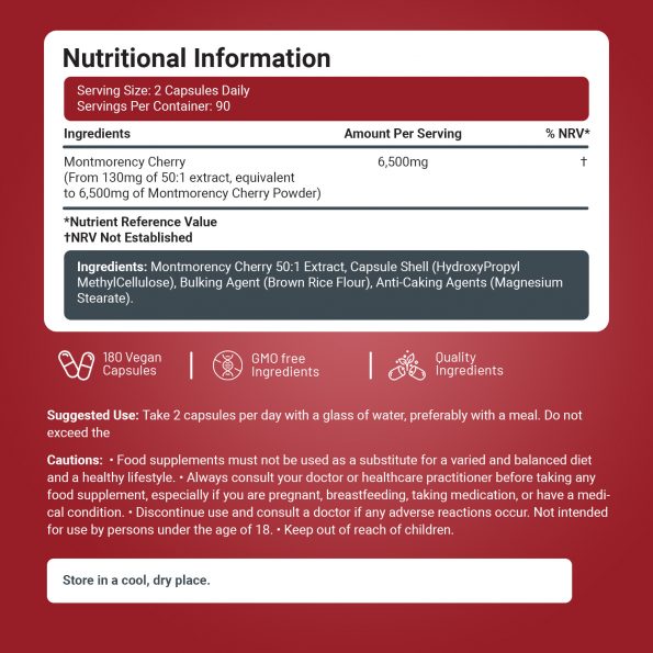 Rich in Antioxidants – Montmorency cherries are known for their high antioxidant content, helping to fight oxidative stress, support immune function, and promote overall well-being. These capsules offer a concentrated dose, making it easy to experience the benefits without consuming large amounts of fresh cherries.