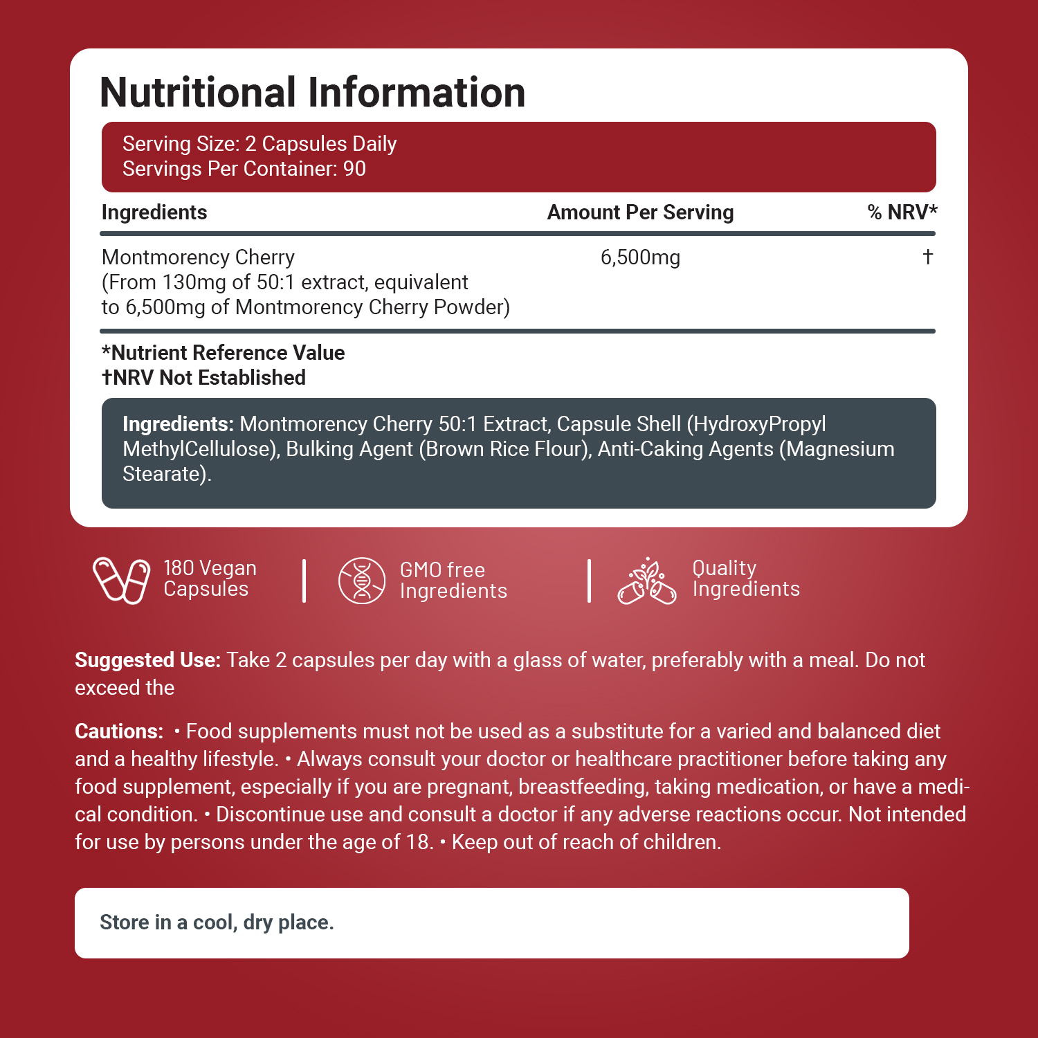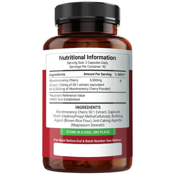 INGREDIENTS: Montmorency Cherry 50:1 Extract, Capsule Shell (HydroxyPropyl MethylCellulose), Bulking Agent (Brown Rice Flour), Anti-Caking Agents (Magnesium Stearate).